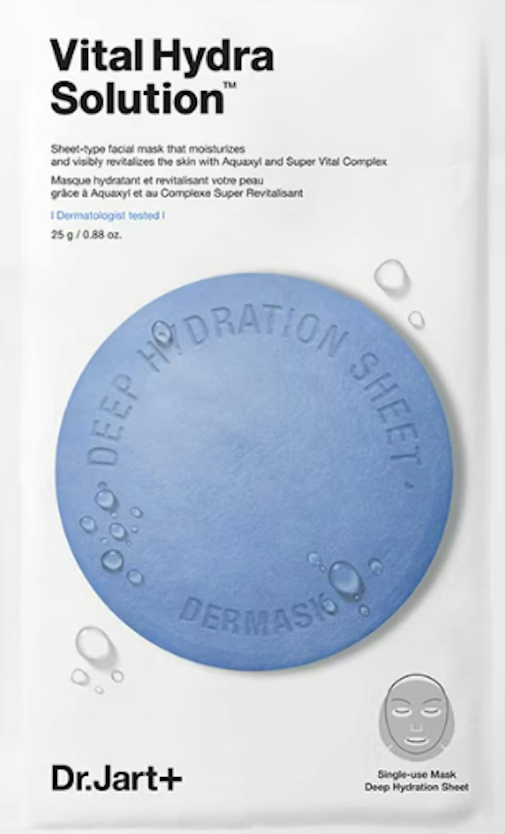 O DR. JART+ Dermask Water Jet Vital Hydra Solution Sheet Mask é uma máscara em folha de celulose que hidrata profundamente, repõe e protege a humidade da pele. Feita de fibras finas de celulose, a máscara transparente e leve permite que a pele absorva totalmente os nutrientes essenciais e os ingredientes hidratantes para uma terapia de hidratação definitiva. O ácido oligo-hialurónico e um extrato de algas apoiam a hidratação de longa duração e a síntese natural de colagénio, enquanto o aquaxil e o xilitol ajudam a aumentar a retenção de humidade e a reforçar a barreira cutânea para manter a pele com um aspeto e uma sensação de hidratação e de frescura total.
