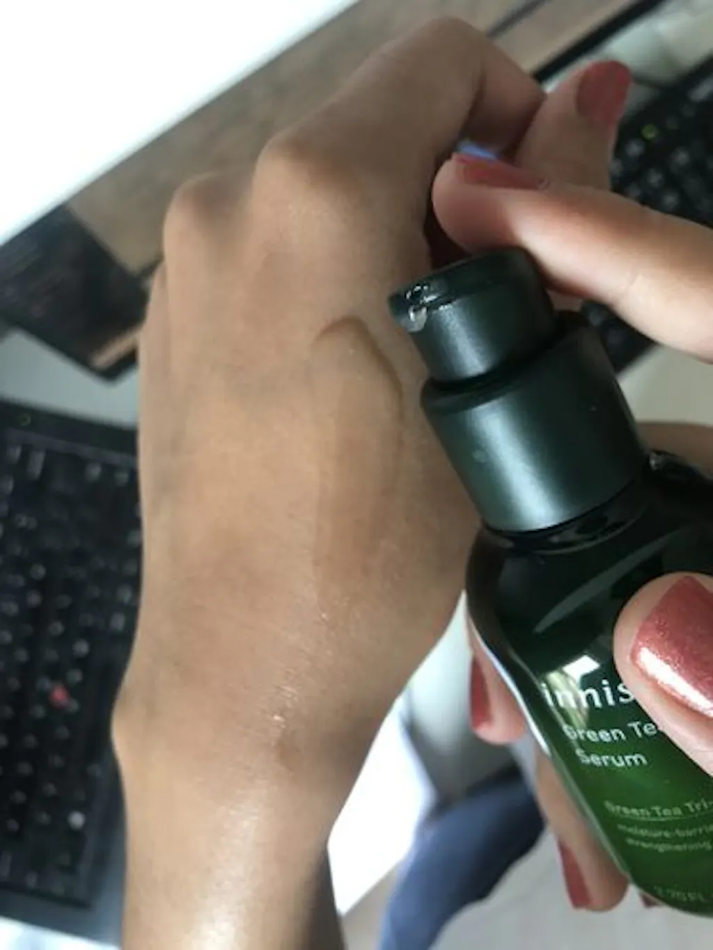 I have sensitive skin, and I use this serum daily! This serum has a mild green tea smell, and the texture is watery, lightweight and moisturising. Best serum I've owned yet!