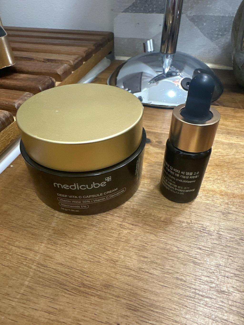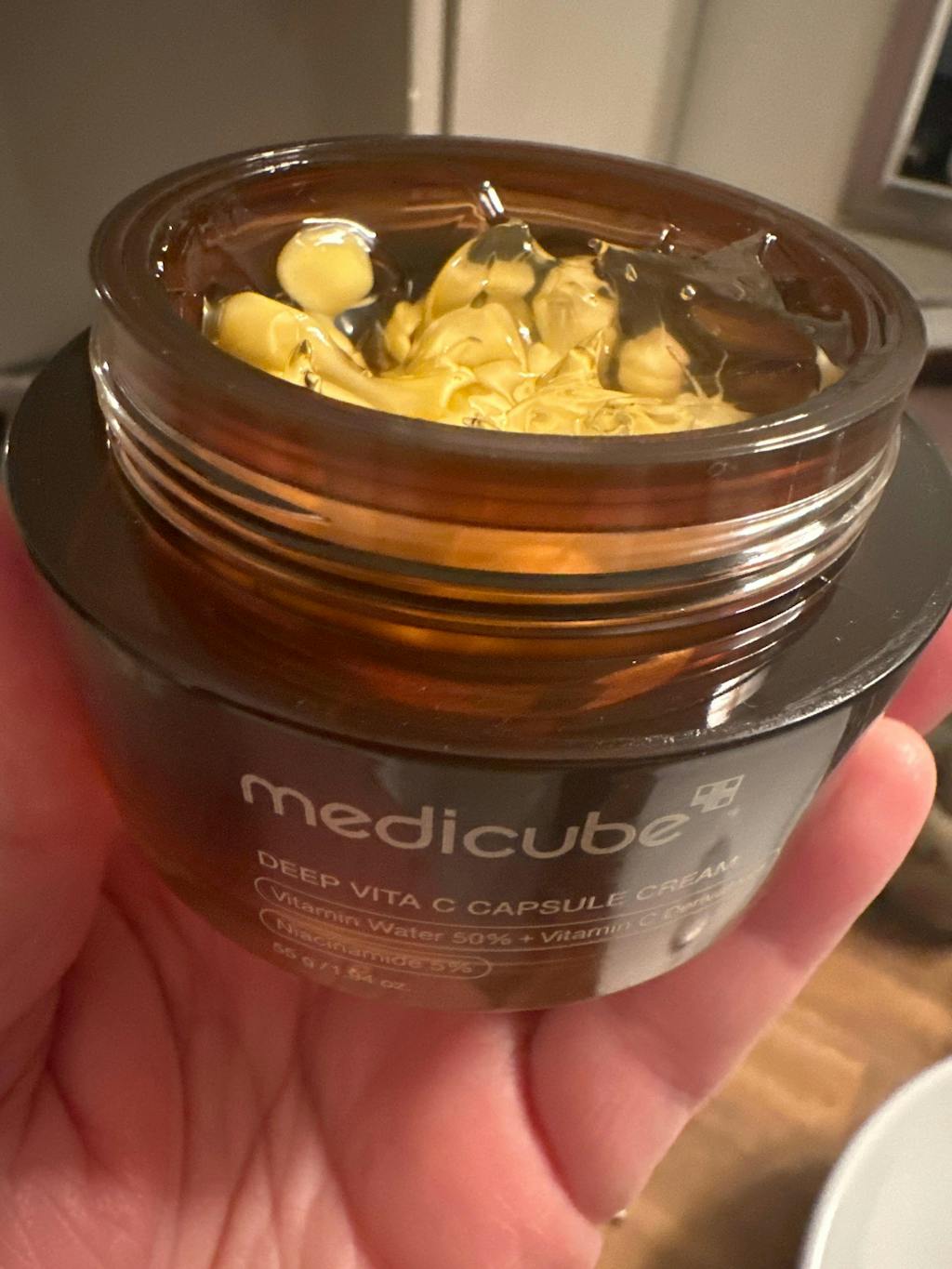 Consegue uma tez radiante e uniforme com o Medicube Deep Vita C Capsule Cream, uma fórmula poderosa para clarear a pele com 500.000 ppm de água da árvore da vitamina, cápsulas de vitamina C e cinco derivados de vitamina C.