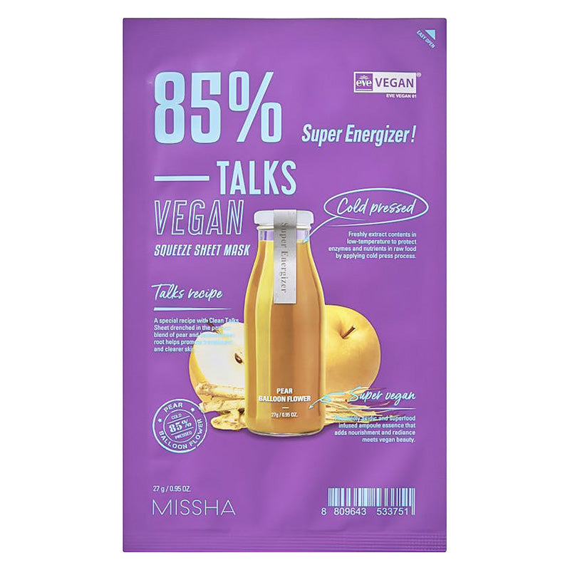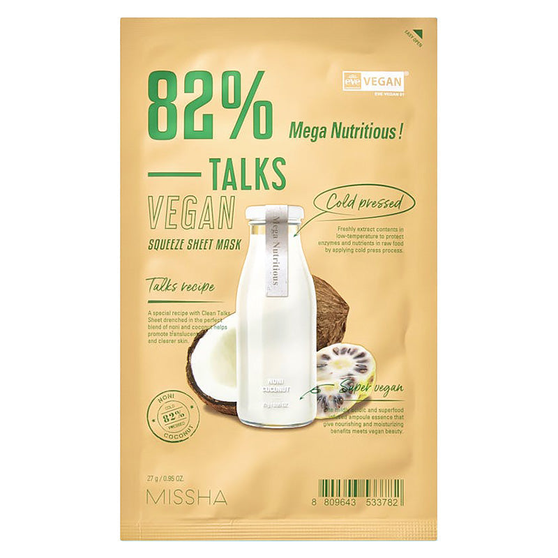 The MISSHA Talks Vegan Squeeze Sheet Mask is a single-use facial mask made with vegan-friendly ingredients and a form-fitting sheet to deliver targeted hydration and nourishment. Designed for a quick and effective skincare boost, this mask helps soothe, moisturize, and revitalize the complexion with a lightweight essence that absorbs easily without stickiness.