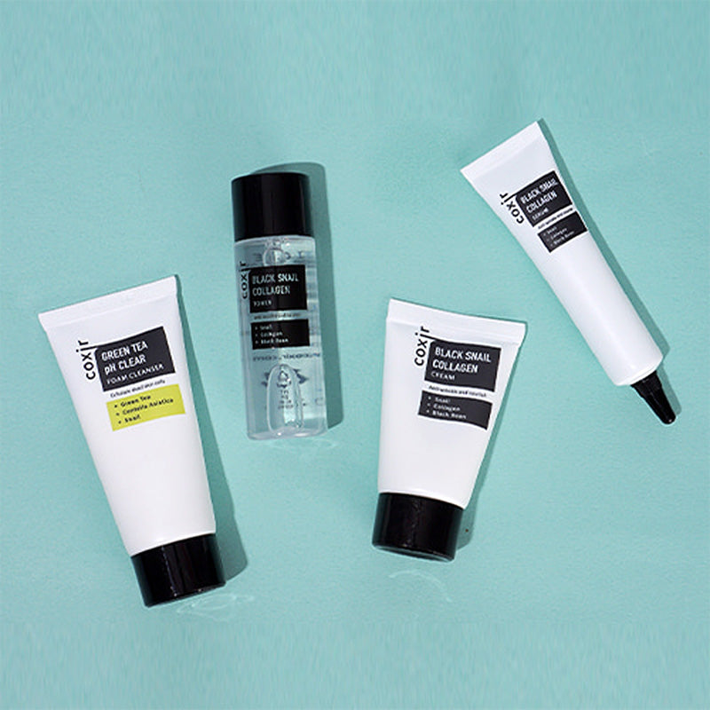 The Black Snail Starter Kit is a four-step travel-size collection that delivers hydration, firming, and skin barrier support through the power of snail mucin and collagen. The kit includes a Green Tea pH Clear Foam Cleanser, Black Snail Collagen Toner, Black Snail Collagen Serum, and Black Snail Collagen Cream. Each product is enriched with snail secretion filtrate, collagen, and nourishing botanicals such as green tea, centella asiatica, black soybean, black rice, and aloe. Together they gently cleanse, deeply hydrate, smooth fine lines, improve elasticity, and restore natural glow while maintaining the skin’s moisture balance.