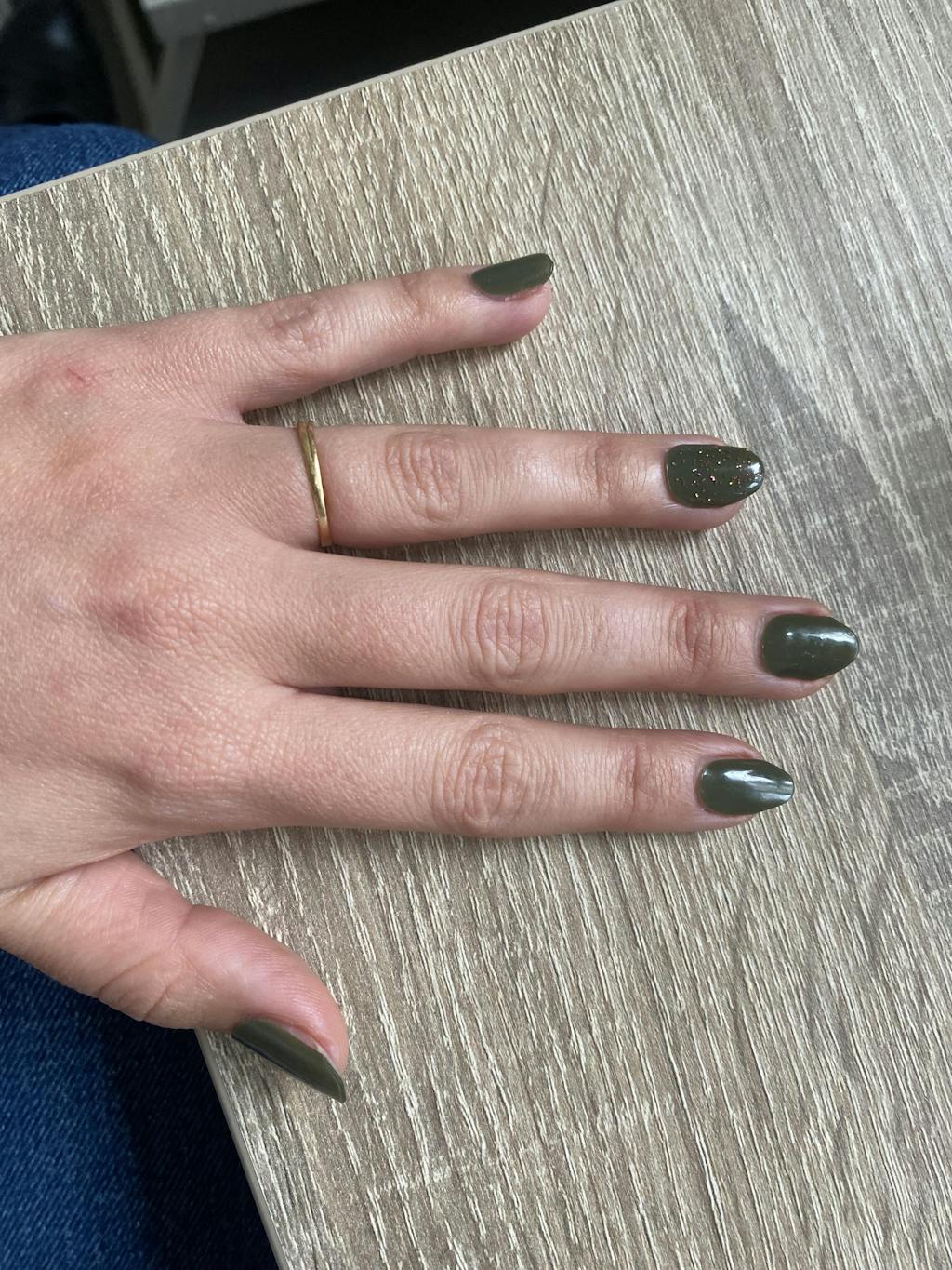 Uma manicure verde musgo perfeita para o outono. Composto por uma fórmula de gel semi-suave para uma cor suave e sem falhas.