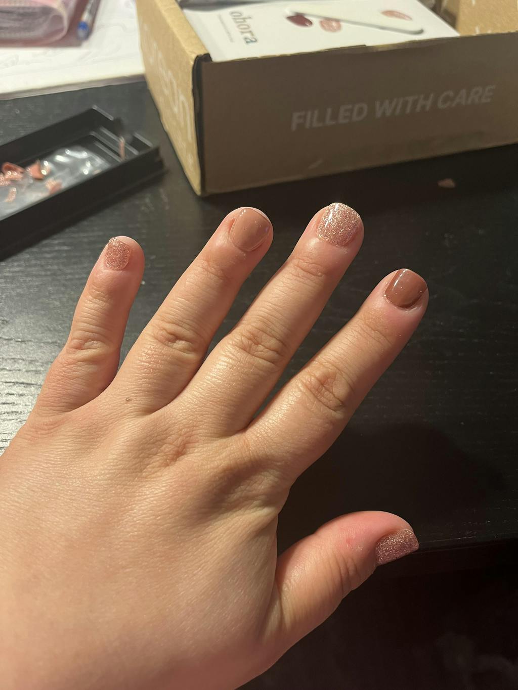 Ilumine as pontas dos seus dedos com glamour! Esta manicure multi-colorida combina gel castanho e pêssego brilhante com glitter rosa-dourado cintilante para um acabamento encantador.